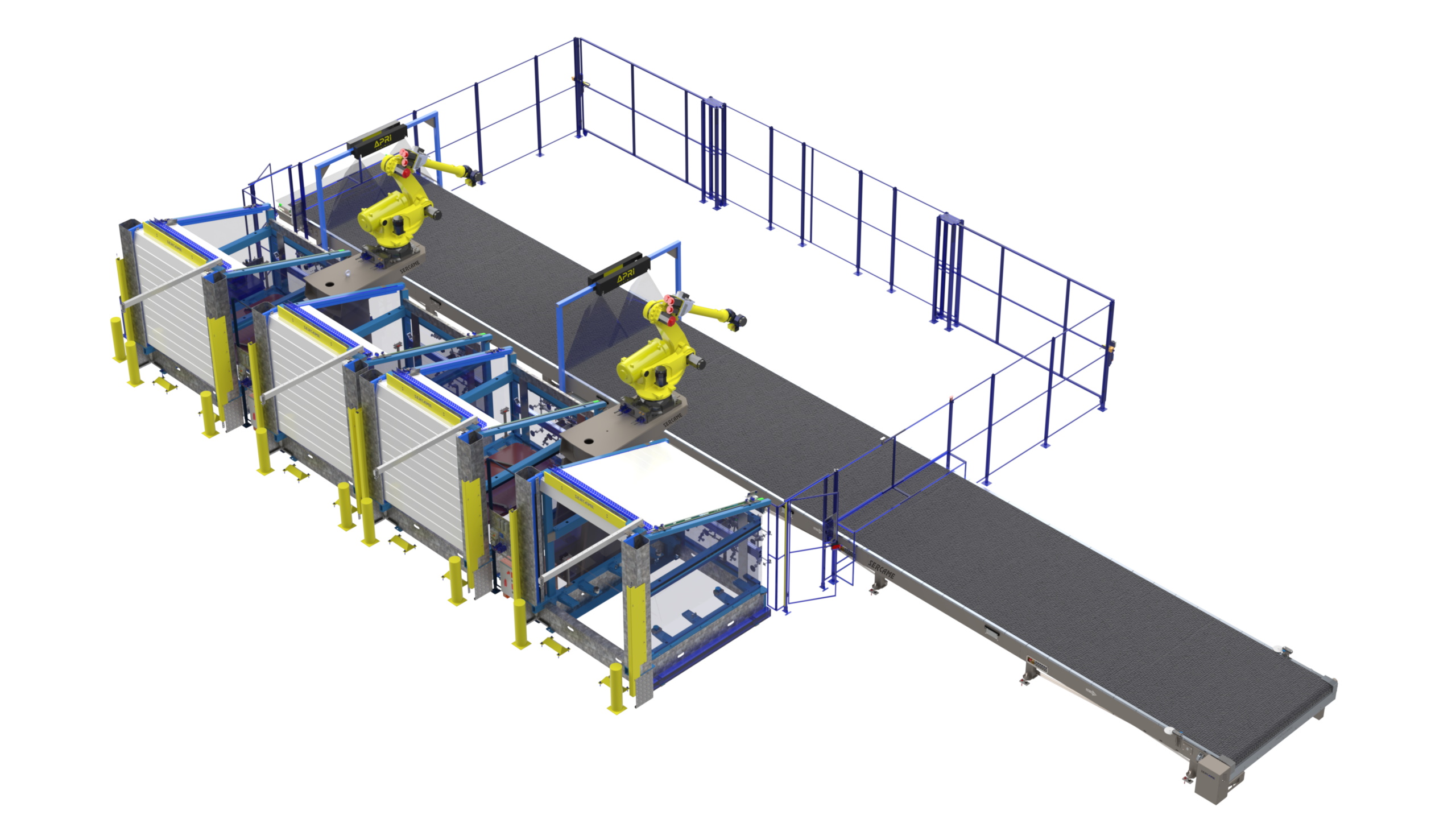 Protected loading zones equipped with reverse-action doors that coordinate robot–operator interaction, enabling continuous and safe operation.