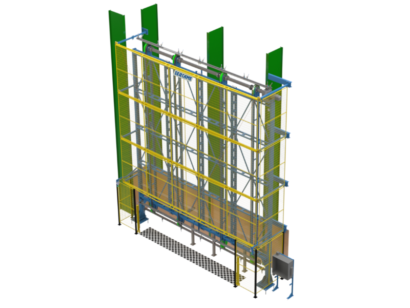 El almacén de garras de Sercame integra bandejas diseñadas para organizar y resguardar de forma segura las garras del transfer. Su configuración vertical optimiza el espacio en planta y facilita el acceso del operario, combinando orden, seguridad y ergonomía en un solo sistema.